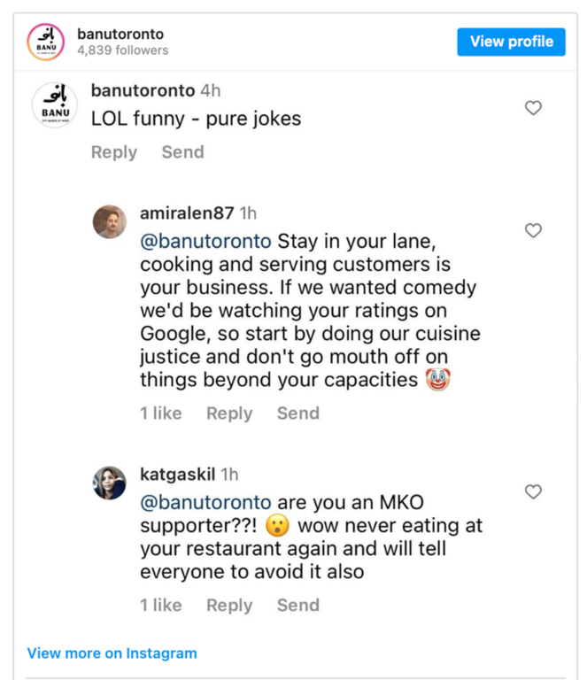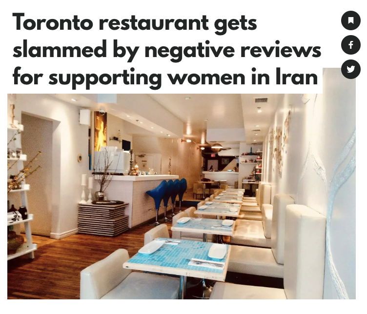 那天听完播客,就看到家附近的伊朗饭店Banu上了[BlogTo](https://www.blogto.com/eat_drink/2023/01/toronto-restaurant-gets-slammed-negative-reviews-supporting-women-iran/),一个多伦多吃喝玩乐的软新闻网站。原来饭店老板在Instagram上高调支持头巾革命,下面留言里有几个亲政府的伊朗侨民骂他;这波攻讦又引来了许多表示同情、要去饭店吃饭支持的人。伊朗侨民社团内的割裂,也很让我想到中国。